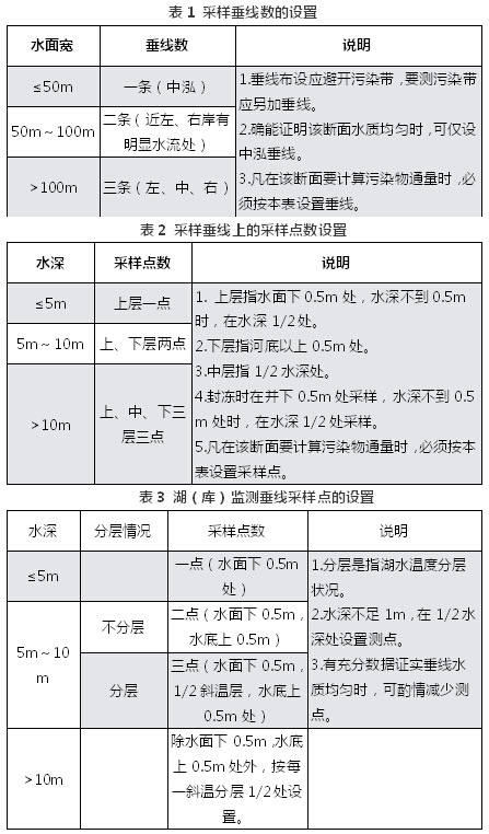 河流监测断面上的采样垂线数见表1,各垂线上的采样点数见表2,湖(库)监测垂线上的采样点的布设见表3。