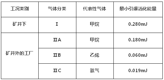 类别:根据可能引爆的最小火花能量,我国和欧洲及世界上大部分国家和地区将爆炸性气体分为四个危险等级,如下: