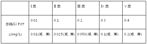 水中磷可以元素磷、正磷酸盐、缩合磷酸盐、焦磷酸盐、偏磷酸盐和有机团结合的磷酸盐等形式存在。其主要来源为生活污水、化肥、有机磷农药及近代洗涤剂所用的磷酸盐增洁剂等。磷酸盐会干扰水厂中的混凝过程。水体中的磷是藻类生长需要的一种关键元素,过量磷是造成水体污秽异臭,使湖泊发生富营养化和海湾出现赤潮的主要原因。我国地面水环境质量标准(G3838-2002)规定总磷容许值如下。