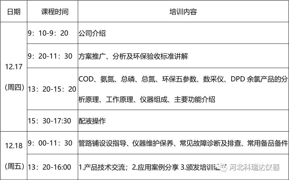 河北科瑞达仪器科技股份有限公司将于2020年12月17-18日,在石家庄总公司新办公地址举办第8期“科瑞达环境仪器使用与维护技术”培训班。