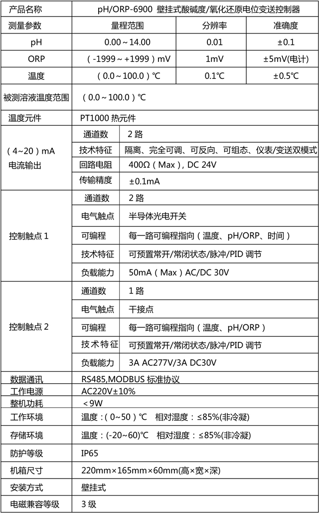 pH/ORP-6900 壁挂式酸碱度/氧化还原电位变送控制器的主要技术指标: