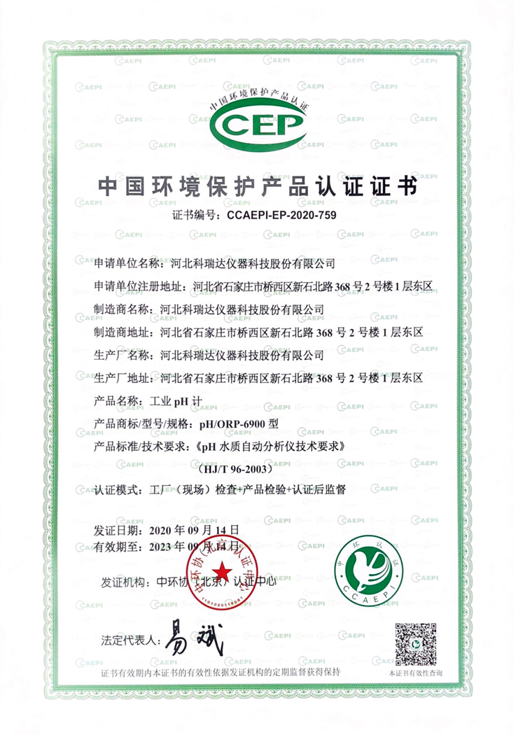 pH-6900工业pH计的环保证书: