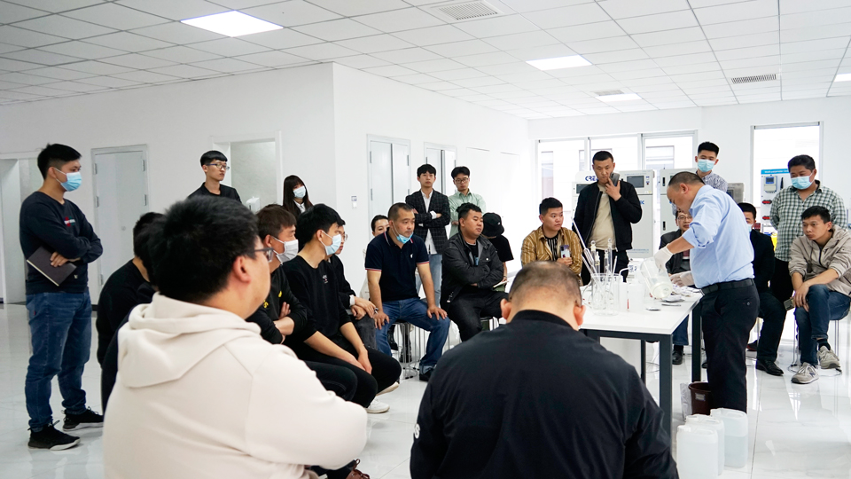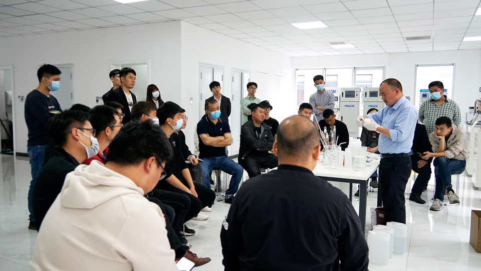 售后工程师闫工给学员们讲解配液操作流程及注意事项;第二天闫工讲解了环境分析仪器在实际安装操作中需要注意的事项及仪器的维护保养等知识。