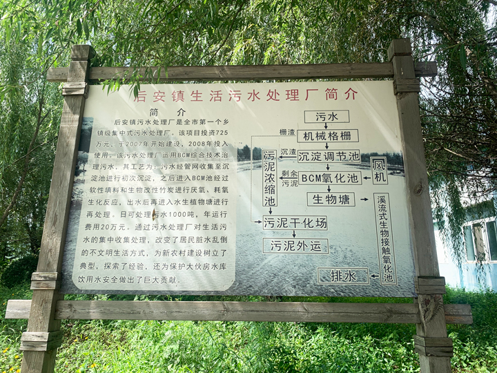 后安镇生活污水处理厂,投资725万元,日可处理污水1000吨。污水处理厂运用BCM综合技术治理污水,其工艺为:污水经管网收集至沉淀池进行初次沉淀,之后进入BCM池经过软性填料和生物改性竹炭进行厌氧、耗氧生化反应,出水后再进入水生植物塘进行再处理。