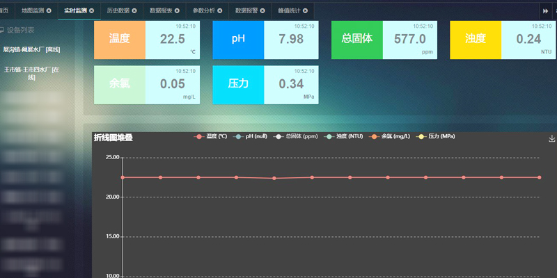 两个自来水厂各安装一台科瑞达仪器MWA-1400水质多参数在线分析仪,检测自来水厂的水质的pH、电导率、激光浊度、温度、DPD余氯五个参数值,以监测两个水厂的水质监测参数是否符合国家《生活饮用水卫生标准》的要求。