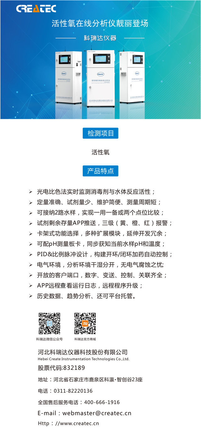 活性氧在线分析仪具有结构简单、维护简便、维护间隔长、测试数据准确、稳定性好等特点。可应用于自来水厂、管网末端等行业。