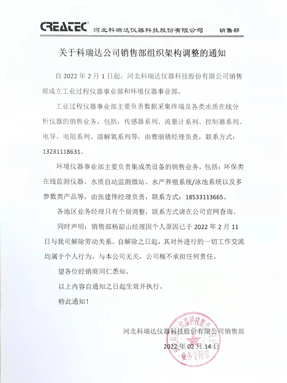 自2022年2月1日起,河北科瑞达仪器科技股份有限公司销售部成立工业过程仪器事业部和环境仪器事业部。详细调整情况见下图