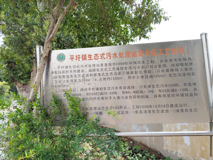 安徽省淮南市潘集区平圩镇生态式污水处理厂,总投资120万元。工艺设计处理能力300m3/d,占地约1200m2。其中主体区域1500m2,生态沟渠构筑而积4000m2。采用生态式工艺减排生活污水进行综合处理,经初级处理,三级垂直滴落生态滤池和跌落式生态沟渠三级串联处理后,污水最终排入淮河。