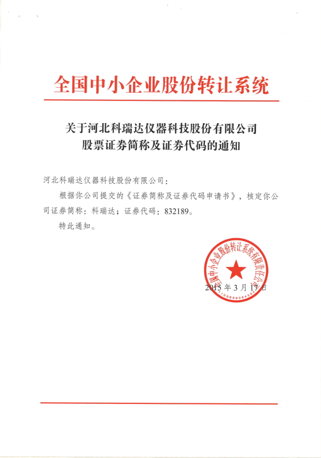 经过全面审核,2014年12月份全国中小企业股份转让系统有限公司受理了我公司的申请挂牌材料,并出具了受理通知书。2015年3月11日全国中小企业股份转让系统有限公司出具同意挂牌的函,3月17日核定我公司证券简称:科瑞达,证券代码:832189。2015年3月30日我公司正式在全国中小企业股转系统挂牌,这意味着科瑞达迎来了一个新的历史发展机遇,在公司发展史上树立了一个新的里程碑。