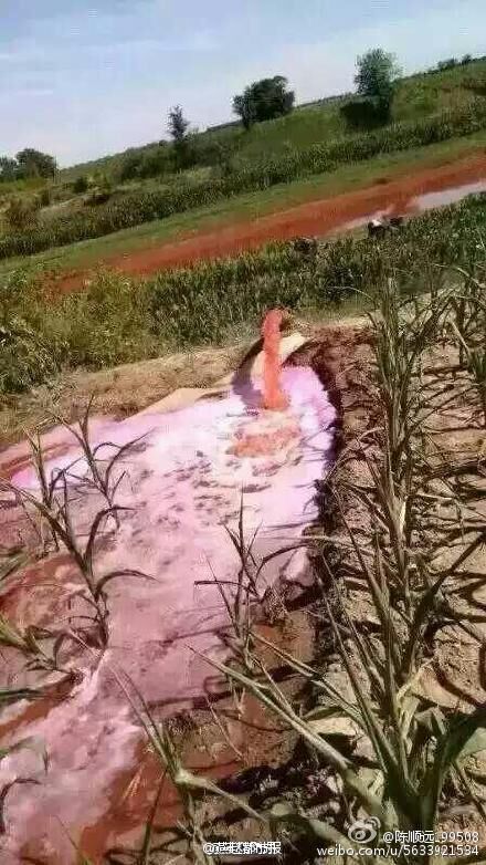 正在用河水浇地的百姓告诉记者,在记者来之前,“血水”已经过境好几天。由于雨水较少,不少百姓开始给庄稼浇水,河水水位因此下降了许多。记者发现,凡是用河水浇过的田地,土地颜色均呈现锈红色,并散发着刺鼻味道。