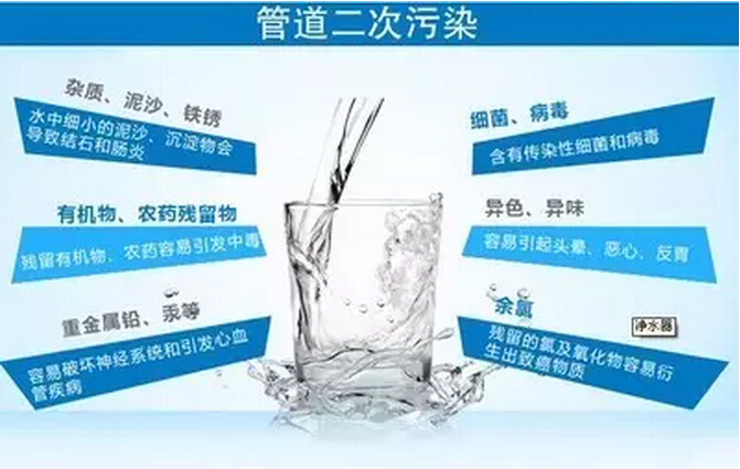 同时,据环保部门的统计,我国水中存在的污染物高达2千多种,其中以有机化学物、碳化物、金属物居多,而自来水也不同程度的含有765种(190种对人体有害,20种致癌,23种疑癌,18种促癌,56种致突变:肿瘤)。如前段时间央视曝光的“南京自来水含有抗生素”和“劣质管道造成的自来水二次污染问题”等事件,无不把居民饮水安全问题推到了风口浪尖。