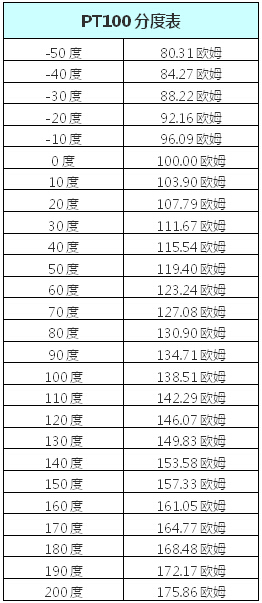 PT100温度感测器是一种以白金(Pt)做成的电阻式温度检测器,属于正电阻系数,其电阻和温度变化的关系式如下:R=Ro(1+αT) 其中α=0.00392,Ro为100Ω(在0℃的电阻值),T为摄氏温度。