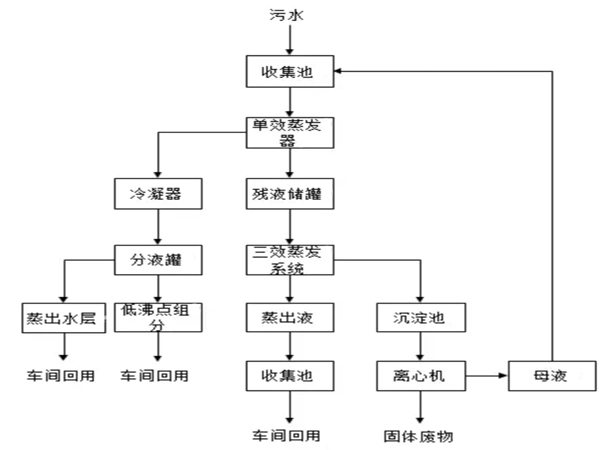 物料流程:废水→单效蒸发器(回收2%低沸点物质)→ 中间槽→三效加热器→三效分离器→二效加热器→二效分离器一效加热器→一效分离器→系统外。