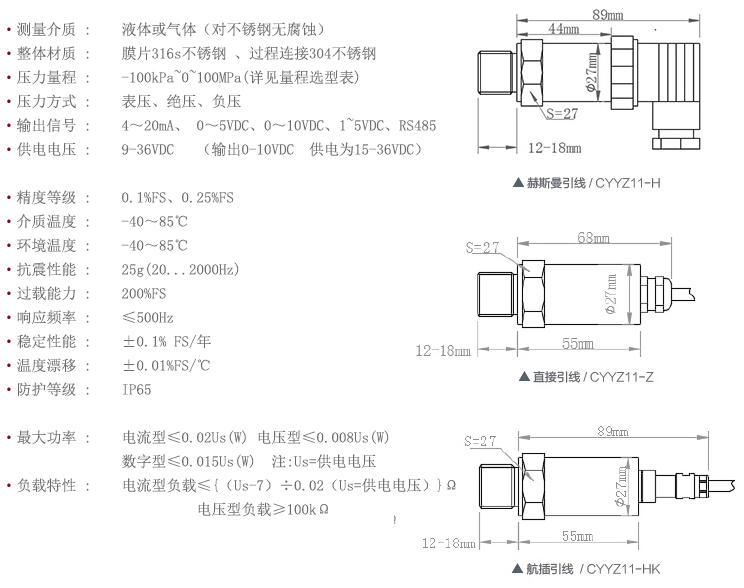 1、采用进口扩散硅压力敏感元件和现金的膜片隔离技术;